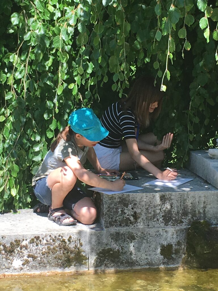 Wir üben uns im Naturstudium, beobachten, was in den Wiesen wächst und an den Bäumen blüht, skizzieren und zeichnen draussen.